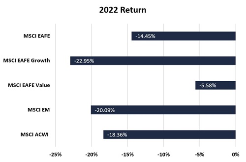International markets fared slightly better. Globally, we saw the fastest-growing inflation since 1981, and virtually no country was spared; even Japan, which had been mired for decades with ultra-low inflation, saw prices shoot up 3.8% in 2022. In the face of this hot, inflationary environment, central banks around the world were forced to tighten monetary policy, driving down asset returns. The MSCI EAFE Index, which tracks developed international markets, finished the year down -14.45% . Driven by weakness in China, which continued to follow a zero-COVID policy for much of the year, emerging markets fell even further, down -20.09% for the year. The MSCI All Country World Index, which tracks the global stock market, finished the year down -18.36%.