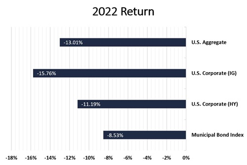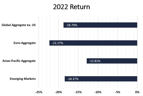 International markets fared slightly better. Globally, we saw the fastest-growing inflation since 1981, and virtually no country was spared; even Japan, which had been mired for decades with ultra-low inflation, saw prices shoot up 3.8% in 2022. In the face of this hot, inflationary environment, central banks around the world were forced to tighten monetary policy, driving down asset returns. The MSCI EAFE Index, which tracks developed international markets, finished the year down -14.45% . Driven by weakness in China, which continued to follow a zero-COVID policy for much of the year, emerging markets fell even further, down -20.09% for the year. The MSCI All Country World Index, which tracks the global stock market, finished the year down -18.36%.