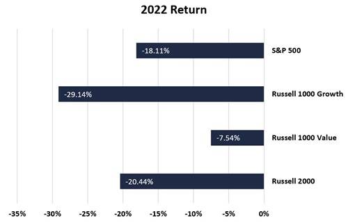 A sea of red. That’s all one sees when looking at a cross-section of stock market returns for 2022. The bellwether for U.S. stock returns, the S&P 500, finished the year down -18.11% , the worst annual return since the Great Financial Crisis in 2008. Small cap stocks were hit even harder, with the Russell 2000 down -20.44% in 2022. U.S. equity performance varied widely by style, however, with value investing returning with a vengeance after years of lagging far behind growth. While still posting negative returns for the year, value stocks offered a relative haven from the carnage, with the S&P 500 Value Index falling only -5.22% in 2022. Growth stocks, led by significant declines in the tech sector, gave back much of the increase experienced during the post-COVID rally, with the S&P 500 Growth Index dropping -29.41% on the year. Looking at the Russell 1000 style indices, which have a longer history than the S&P family, the only calendar year in the past 43 years in which value outperformed growth by a larger margin was 2000, when the tech bubble popped. Performance also varied widely across sectors and industries. Energy was the only S&P 500 sector to finish the year in the green, benefiting from the disruptions to energy markets largely caused by the Russian invasion of Ukraine. After years of lagging performance, the sector ended 2022 up an eye-popping 59.04%, the best year for the sector since 1980. Communication Services, Consumer Discretionary, and Information Technology were the laggards in 2022, as rising interest rates reduced the present value of cash flows expected to be earned far into the future, and high levels of inflation reduced consumers’ discretionary spending. The Communication Services sector – which includes Google parent Alphabet, Facebook parent Meta Platforms, and streaming giant Netflix – was hit particularly hard, ending the year down -40.42%.